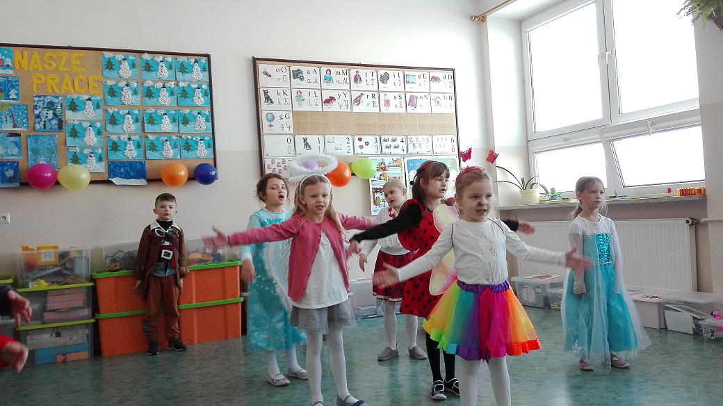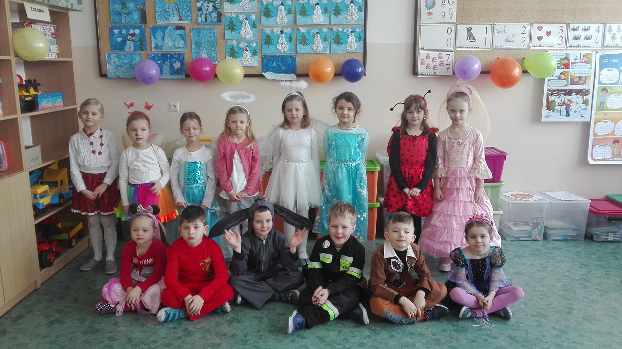 16 lutego 2021r. w oddziale przedszkolnym odbył się bal ostatkowy. Wszystkie dzieci były przebrane w bajkowe stroje. Na balu pojawiły się wróżki, anioły, motyle, biedronki, piraci i wiele innych postaci. Dzieci z ochotą uczestniczyły w tańcach, zabawach i konkursach. Podczas pląsów było wesoło i kolorowo. Wspólna zabawa przyniosła wiele radości. To był wspaniały bal.