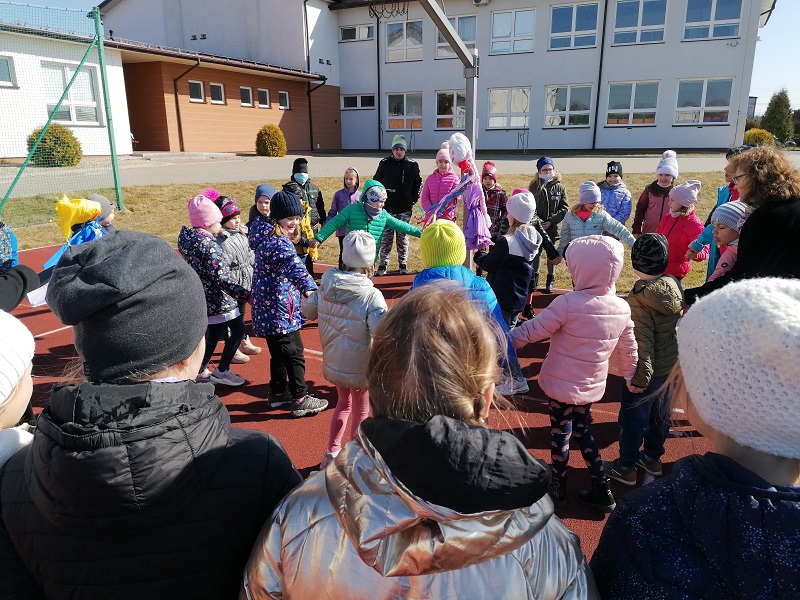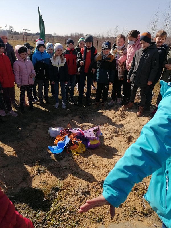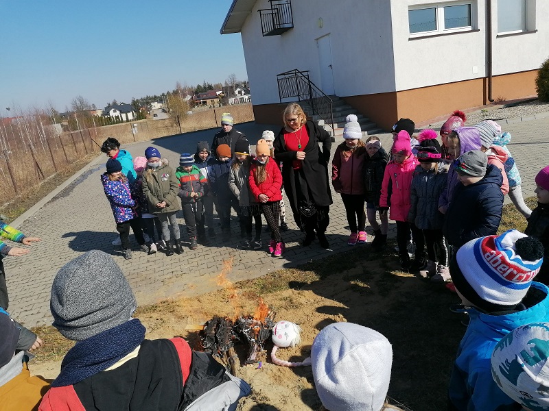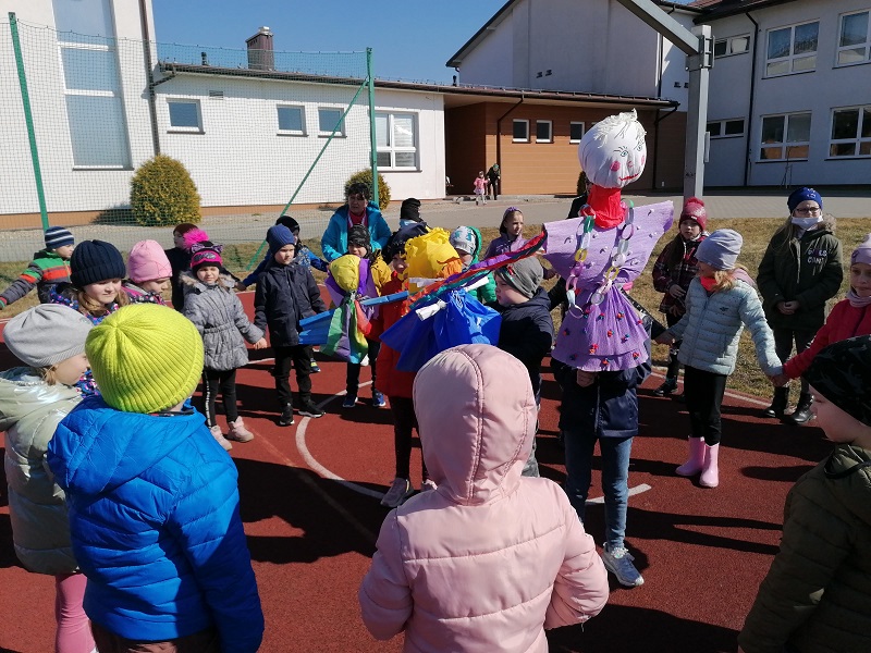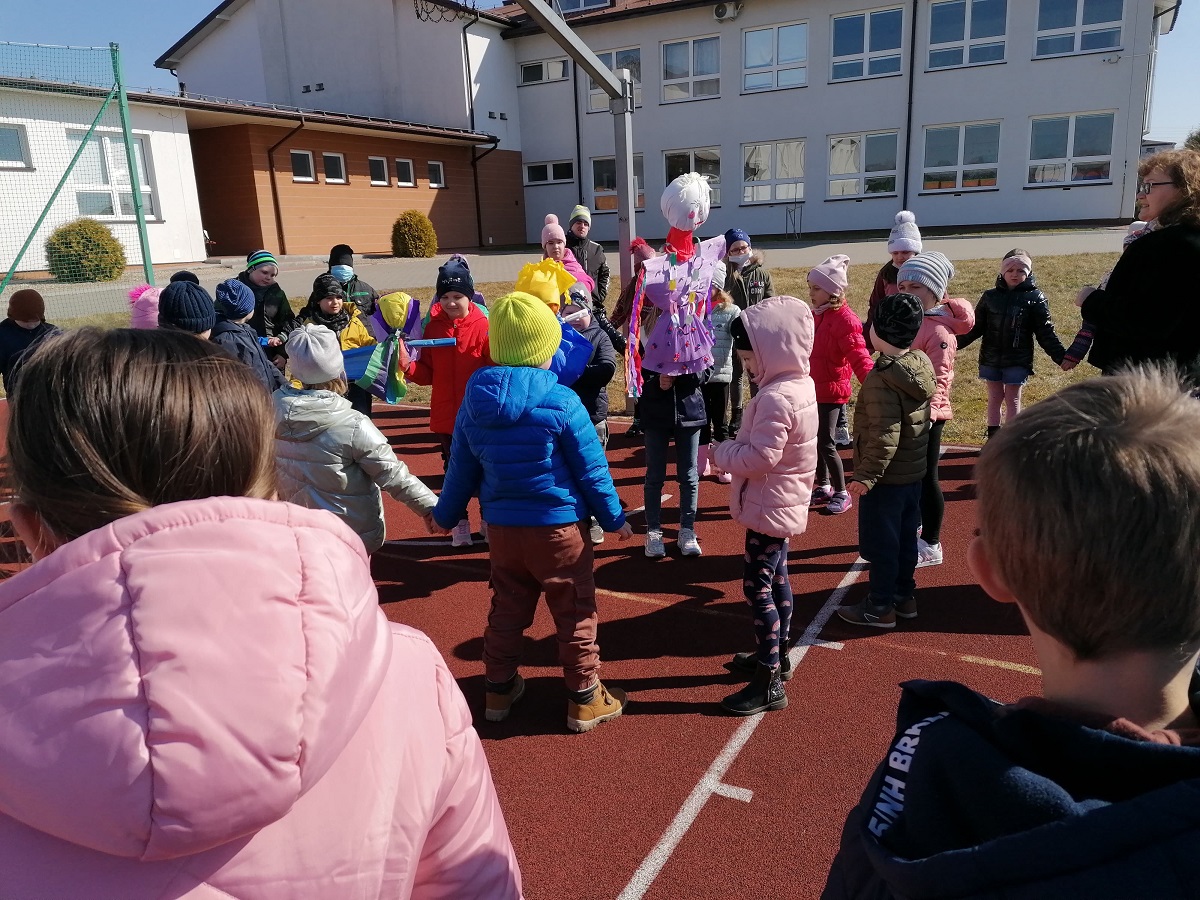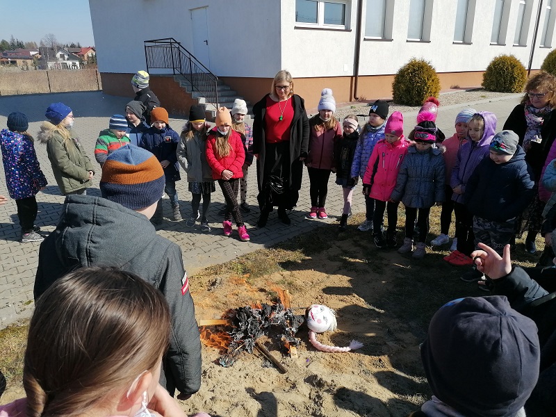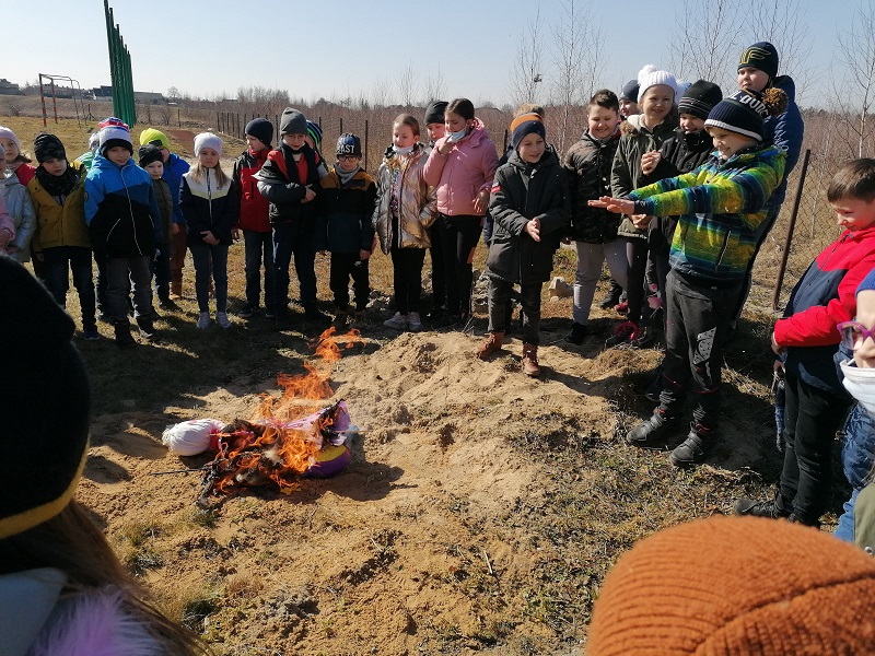 W poniedziałek 21 marca 2022r. uczniowie klas 0-3 oficjalnie powitali wiosnę. Dzień ten był długo wyczekiwany przez wszystkich. Uczniowie recytowali wiersze i śpiewali piosenki mówiące o odejściu zimy i powitaniu wiosny. Na koniec pod czujnym okiem nauczycieli zostały spalone przygotowane przez uczniów kukły. Radosnym okrzykom dzieci nie było końca.