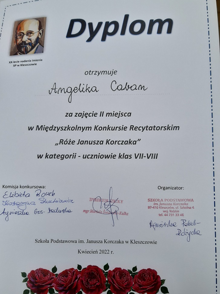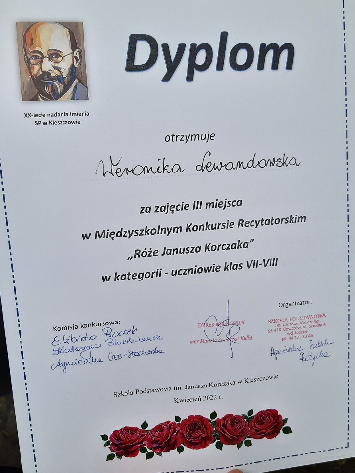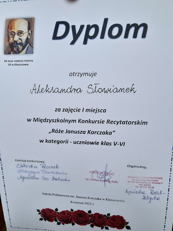 W dniu 06. kwietnia 2022 roku dzieci z naszej szkoły uczestniczyły w Międzyszkolnym Konkursie Recytatorskim pt. ,,Róże Janusza Korczaka" zorganizowanym przez Szkołę Podstawową im. J. Korczaka w Kleszczowie. Turniej był adresowany do uczniów klas V-VIII szkół podstawowych z Kleszczowa i regionu. Cele konkursu to: upamiętnienie patrona szkoły - Janusza Korczaka, przybliżenie faktów z życia, idei oraz osobowości znakomitego pedagoga, uwrażliwienie na piękno literatury polskiej, promowanie poprawnej i pięknej wymowy, rozwijanie uzdolnień twórczych i doskonalenie umiejętności recytatorskich, integracja uczniów z regionu oraz popularyzacja konkursu jako jednej z form rozwijania zainteresowań i uzdolnień. Dzięki udziałowi w zmaganiach recytatorskich uczniowie naszej szkoły mieli możność złożyć hołd patronowi poprzez kulturę ,,żywego słowa", zagłębić się w świat pięknej i przejmującej w swoim wyrazie poezji poświęconej Korczakowi. Dzieci i młodzież zaprezentowały się godnie. W kategorii uczniów klas V-VI nagrodę zdobyła uczennica klasy piątej Aleksandra Słowianek, zajmując I miejsce. Wyróżnienie otrzymała Hanna Janiec, również z kl. 5. W kategorii uczniów starszych, klas VII-VIII, nagrodzone zostały uczennice klasy siódmej a: Angelika Caban - II miejsce w konkursie i Weronika Lewandowska - III miejsce. Jury zwróciło uwagę na wzruszające interpretacje wierszy. Miło było gościć w murach szkoły imienia tego samego patrona. Występujących dopingowała nieduża publiczność, uczniowie naszej szkoły, którzy pragną rozwijać swoje umiejętności recytatorskie. Zwieńczeniem wycieczki było obejrzenie tarasu widokowego Kopalni Bełchatów. Uczestników przygotowała do występu polonistka Agnieszka Czechowska, a wyjazd został sfinansowany przez Radę Rodziców. Gratulujemy nagrodzonym!