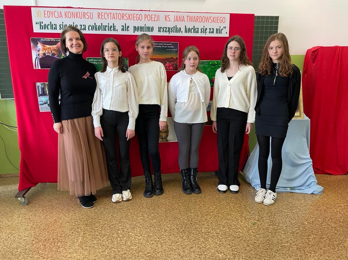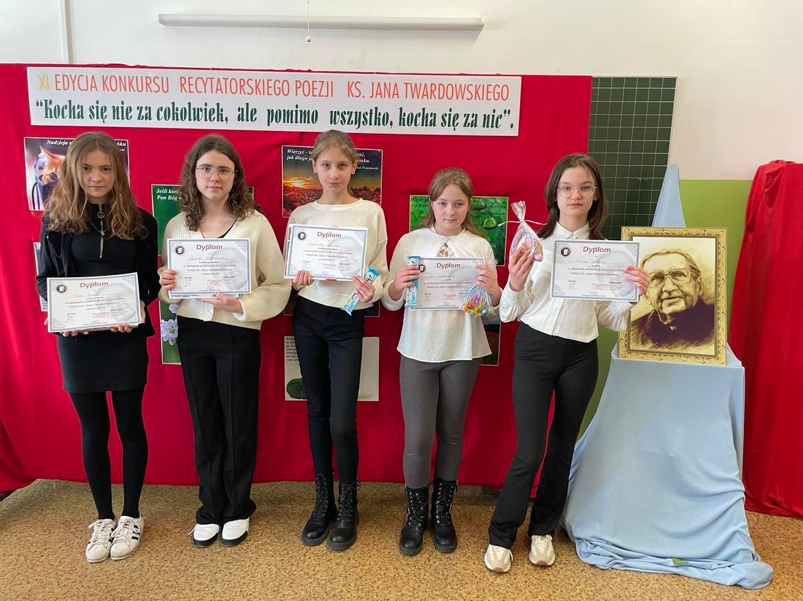 W dniu 29 marca 2023 r. uczennice naszej szkoły z klas IV- VIII (Maja Szymańska z kl. IV, Kalina Jędrzejczyk z kl. V, Aleksandra Słowianek z kl. VI, Oliwia Kawnik z kl. VII i Weronika Lewandowska z kl. VIII a) wzięły udział w XI Międzyszkolnym Konkursie Recytatorskim Poezji ks. Jana Twardowskiego organizowanym przez Szkołę Podstawową im. św. Stanisława Kostki w Moszczenicy. Miło nam poinformować, iż uczennice: Aleksandra Słowianek z kl. VI i Weronika Lewandowska z kl. VIIIa otrzymały: Wyróżnienia, zaś Oliwia Kawnik z kl. VII otrzymała: Nagrodę w w/w konkursie. Uczennice biorące udział w zmaganiach recytatorskich otrzymały słodkie upominki. W przerwie konkursu zorganizowano dla uczniów poczęstunek. Uczennice przygotowały do występu recytatorskiego: p. Agnieszka Czechowska i p. Iwona Jędrzejczyk.