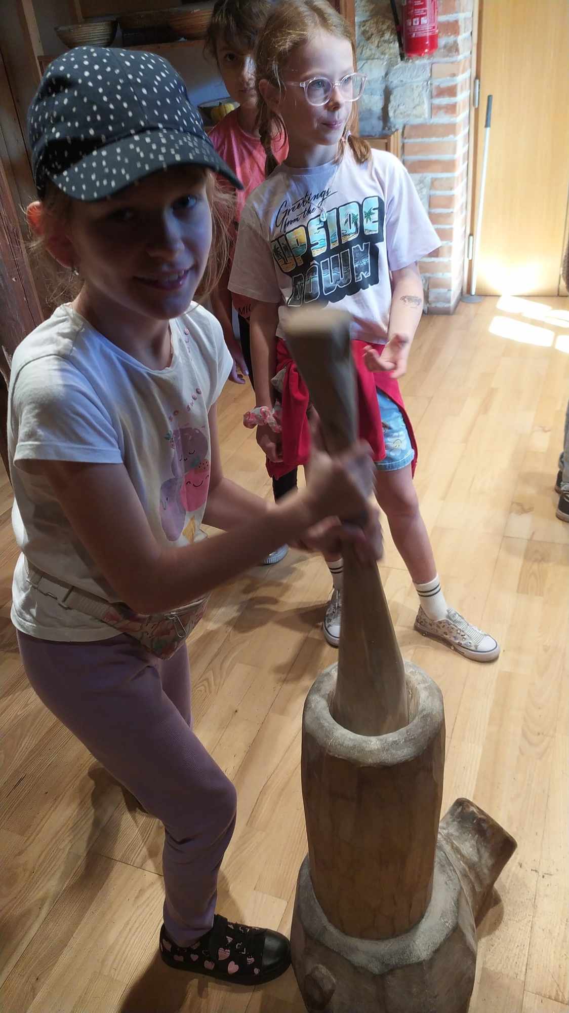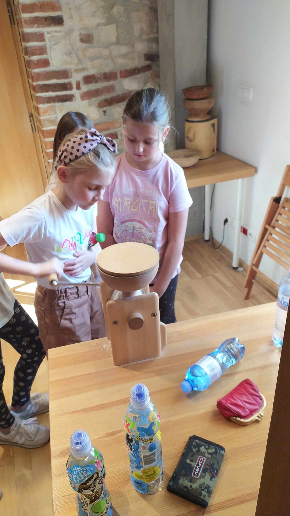 zabawy. Uczniowie mełli mąkę na żarnach lub