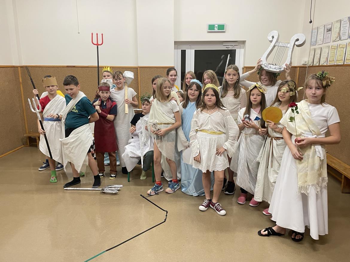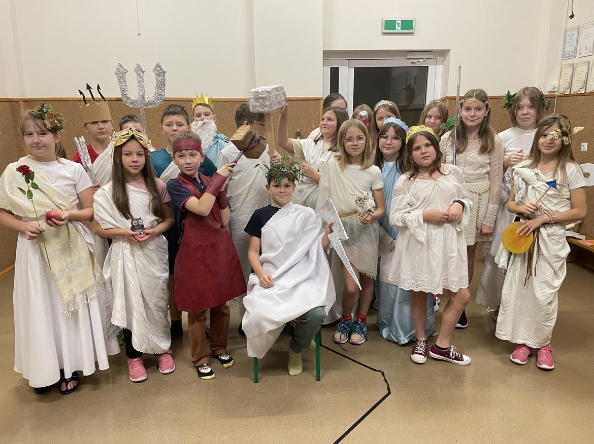 Uczniowie klasy 5 dnia 21 listopada br. zanurzyli się w świat greckich bogów. Lekcja historii stała się nie tylko zabawą, ale i formą powtórzenia wiadomości o wierzeniach starożytnych Greków. Koleżanki i koledzy z klasy wcielili się w wybraną przez siebie postać greckiej bogini czy boga. Dzięki przygotowanemu strojowi i atrybutowi wybranego bóstwa emanowali mocą podczas indywidualnej prezentacji. Wśród bóstw największą popularnością cieszyli się: Zeus z piorunem jako swoim atrybutem, Atena z tarczą bądź sową , Afrodyta z jabłkiem lub różą, Hefajstos z młotem kowalskim czy też Posejdon z trójzębem. Pani Iwona Jędrzejczyk nagrodziła wszystkich najwyższą oceną nie tylko za wiedzę ale też za zaangażowanie w przygotowanie stroju.