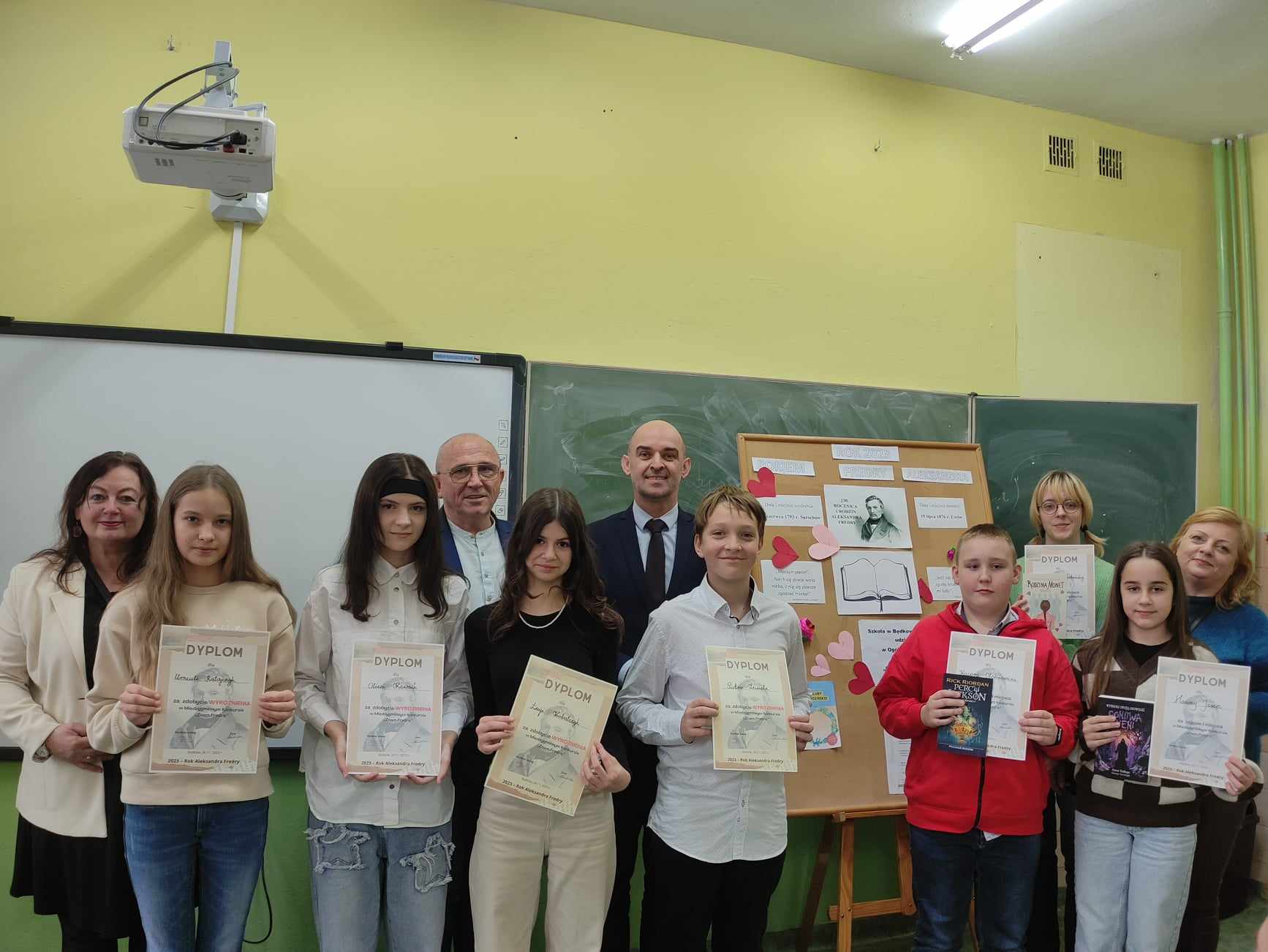 W dniu 28 listopada 2023 r. uczniowie naszej szkoły wzięli udział w Międzygminnym Konkursie Wiedzy o życiu i twórczości Aleksandra Fredry pt. ,,Znam Fredrę" z okazji 230 rocznicy urodzin znakomitego polskiego komediopisarza przypadającej w tym roku. Uczniowie rozwiązywali test ułożony przez polonistkę Szkoły Podstawowej w Będkowie P. Agatę Karlińską. Uczniowie naszej szkoły stanęli na podium i zdobyli kolejno :I miejsce w konkursie bezapelacyjnie wygrała uczennica kl. VII Hanna Janiec, II miejsce zajęła uczennica kl. VIII Izabella Szczerbińska, III miejsce uzyskał uczeń kl. VII Kacper Oleksiewicz. Uczniowie otrzymali w nagrodę literaturę młodzieżową, a wszyscy uczestnicy za udzaił w konkursie - piękne dyplomy z wizerunkiem Aleksandra Fredry. Nagrody wręczał dyrektor Szkoły Podstawowej w Będkowie P. Andrzej Szklarek oraz wójt Gminy Będków P. Dariusz Misztal. Wyróżnienia w turnieju otrzymali: uczniowie naszej szkoły: Oliwia Kawnik z kl. VIII, Urszula Ratajczyk z kl. VII oraz dwoje uczniów Szkoły Podstawowej w Będkowie. Uczniów naszej szkoły przygotowała do konkursu polonistka Agnieszka Czechowska. Zwycięzcom gratulujemy!.