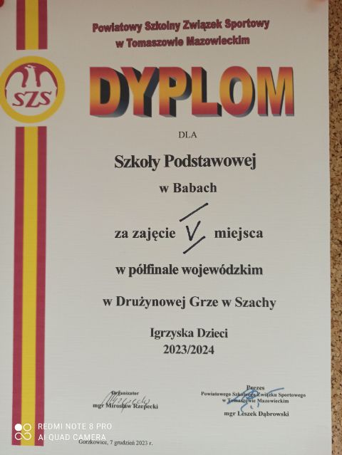 w kategorii: rocznik 2011 i młodsi zajęliśmy II miejsce - skład drużyny: K. Cichura, A. Ruciński, W. Olejnik. I. Lewandowski, K. Jędzrejczyk i tym samym awansowaliśmy do Półfinału Wojewódzkiego w drużynowej grze w szachy.