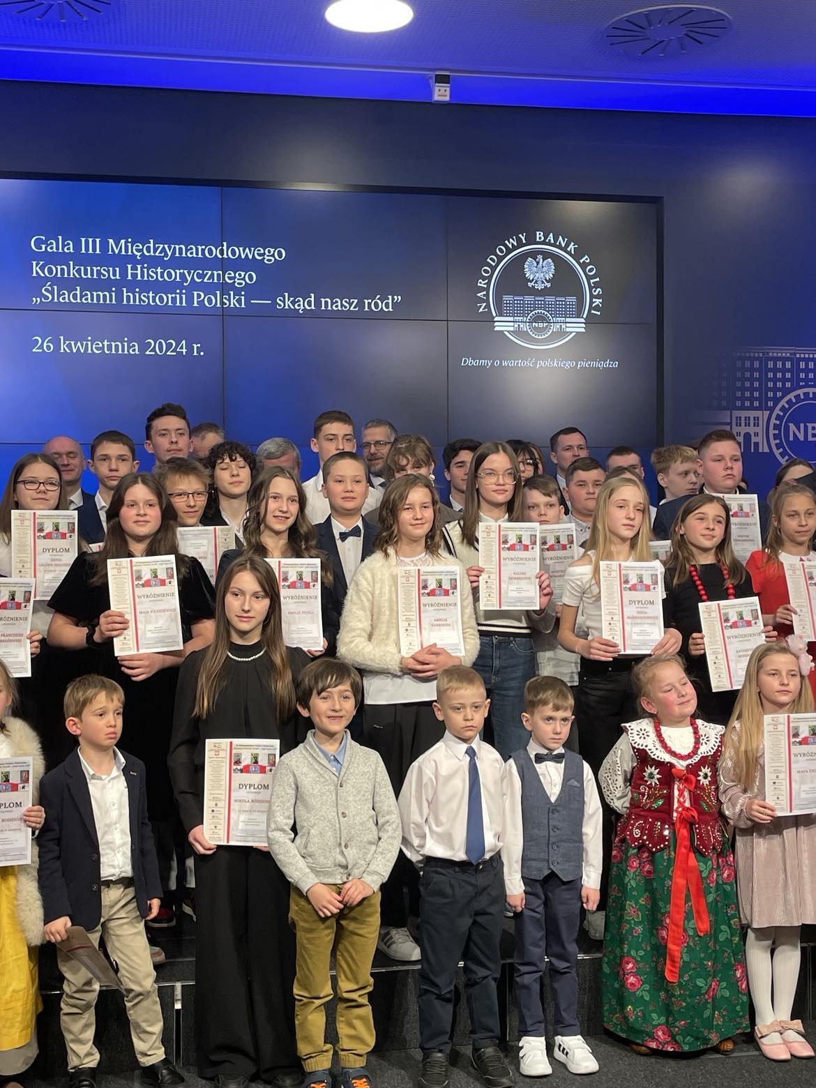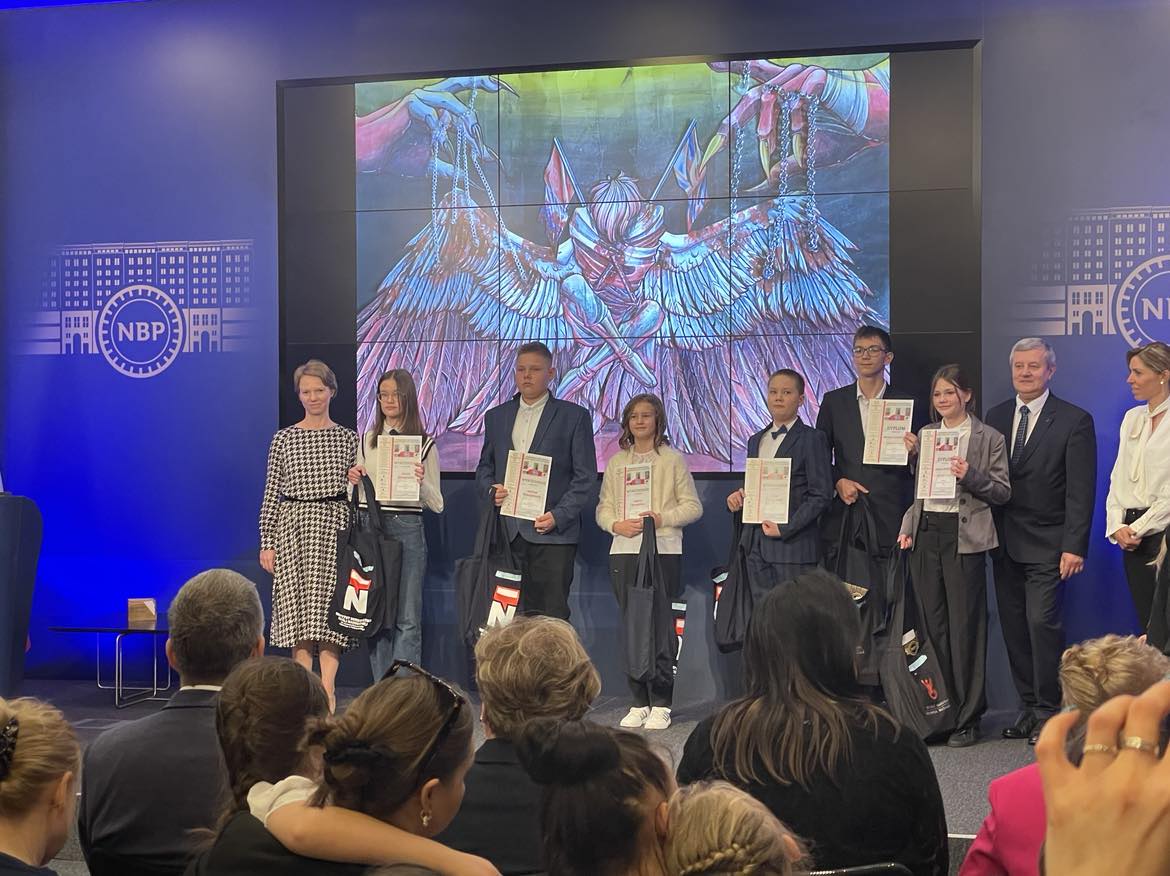 26 kwietnia 2024 r. w Narodowym Banku Polskim odbyła się Uroczysta Gala rozdania nagród w III Międzynarodowym Konkursie Historycznym "Śladami historii Polski - skąd nasz ród". Patronat Honorowy w/w Konkursu objął Prezydent Rzeczypospolitej Polskiej Andrzej Duda, zaś organizatorem był Komitet Pamięci Rotmistrza Witolda Pileckiego w Warszawie. Celem konkursu było kształtowanie postaw patriotycznych młodzieży poprzez propagowanie i pogłębianie wiedzy, przybliżenie historii państwa i narodu polskiego, budzenie i utrwalanie dumy z dziedzictwa narodowego, promowanie postaw patriotycznych i kształtowanie młodego pokolenia świadomego swej tożsamości, w tym promowanie młodych twórców i zachęcanie ich do doskonalenia umiejętności plastycznych oraz popularyzowanie poezji o tematyce patriotycznej. W tym ostatnim udało nam się odnieść sukces. Uczennica naszej szkoły, Kalina Jędrzejczyk z kl.6 otrzymała Wyróżnienie w kategorii: Poezja (klasy 4-8 szkoły podstawowe). Opiekunem merytorycznym, była p. Iwona Jędrzejczyk, nauczyciel historii i języka polskiego w naszej szkole. Dodajmy, że w konkursie licznie wzięli udział uczniowie klasy 1 pod opieką p. Elżbiety Królikiewicz.