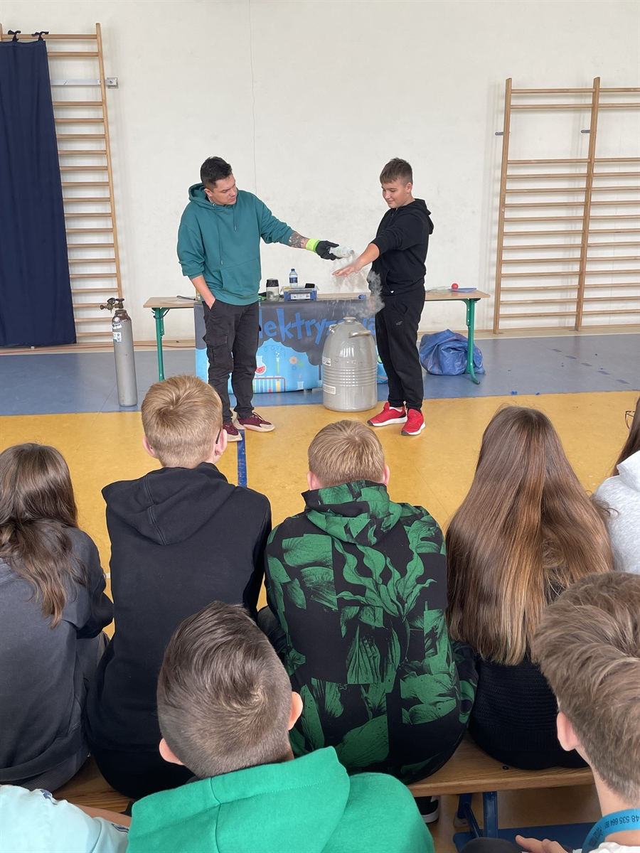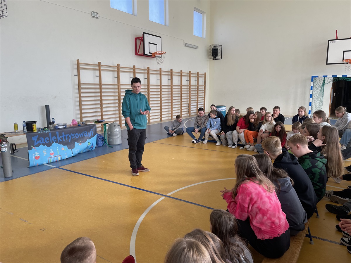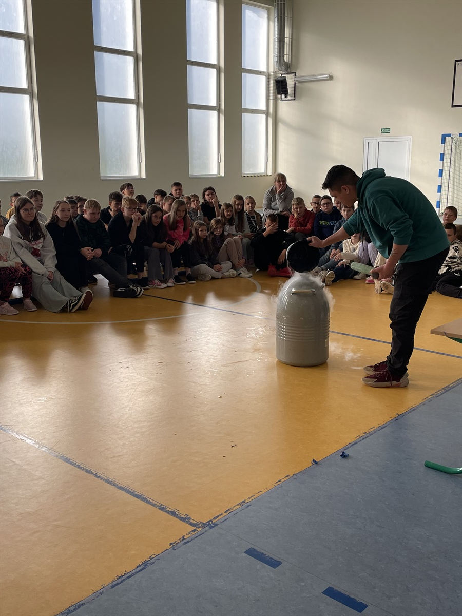 21 października uczniowie klas IV-VIII uczestniczyli w spektaklu pt. ,,Zasady fizyczne czy kwasy chemiczne" w ramach którego mogli obejrzeć eksperymenty związane z naukami przyrodniczymi i dowiedzieć się na czym polegają m.in. zabawy z ciekłym azotem, z helem. Uczniowie wykonywali doświadczenia związane z napięciem powierzchniowym, działaniem sił odśrodkowych i wiele innych.