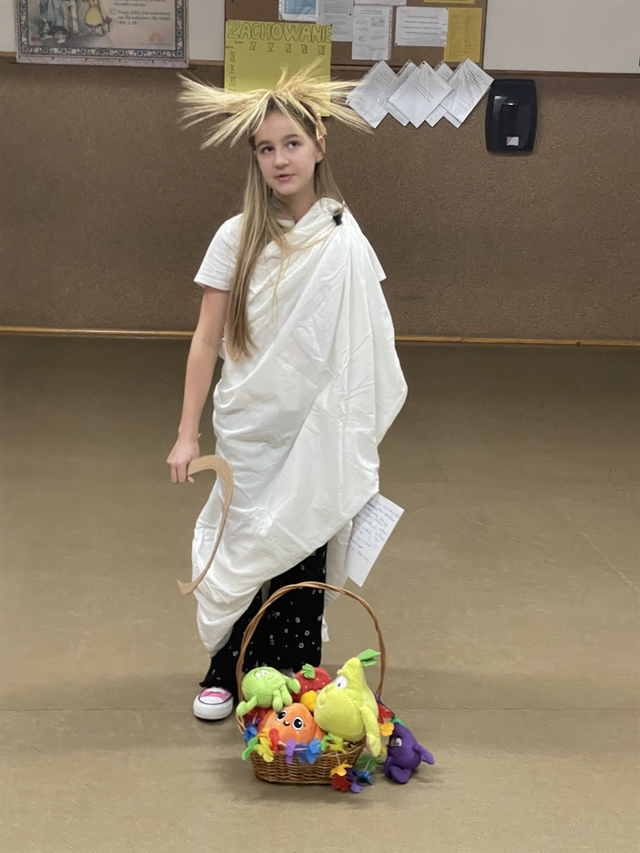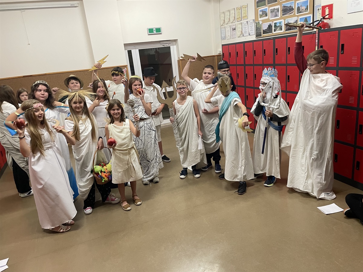 W dniu 29 października 2024 r. uczniowie klasy 5 spotkali się z bogami i boginiami greckimi na korytarzu szkolnym. Uczniowie wcielali się w różne postacie i prezentowali swoją postać. Oprócz odzienia nie zabrakło atrybutów charakterystycznych dla danego bóstwa. Ten pokaz był formą powtórzenia do sprawdzianu jaki czeka klasę 5 z historii.