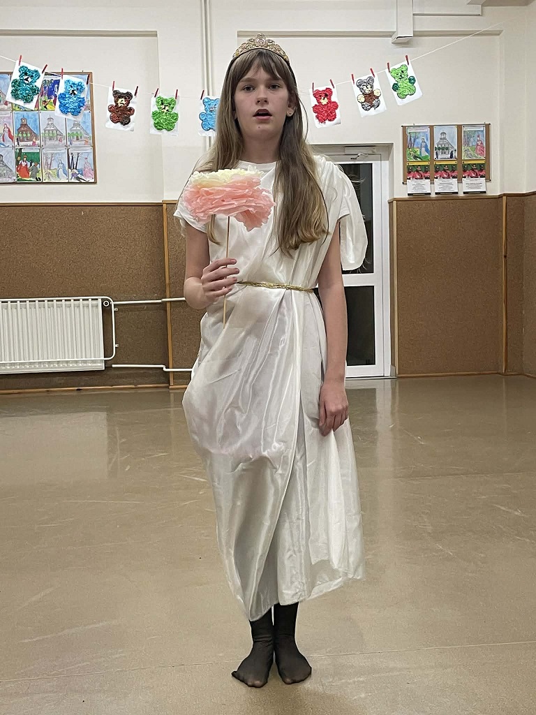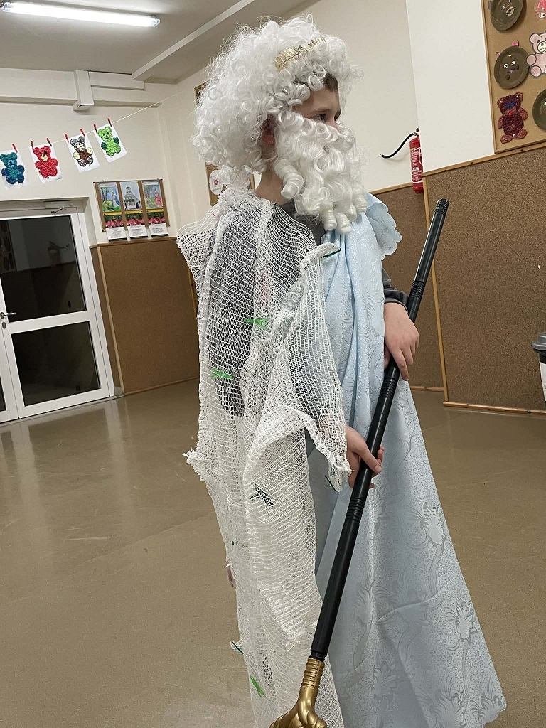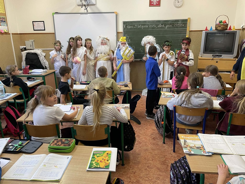 Rokrocznie uczniowie klasy 5 biorą udział w szkolnym projekcie „Wśród starożytnych bogów”, który kończy omawianie epoki starożytnej na lekcjach historii. Uczniowie tym razem mogli wcielić się w boga czy boginię grecką czy rzymską. Dzieci miały za zadanie wcielić się w daną postać i przedstawić charakterystyczne dla niej atrybuty. Piątoklasiści może nie zawitali na grecki Olimp , ale odwiedzili najmłodsze koleżanki i kolegów, którzy z zainteresowaniem oglądali stroje i przedmioty, które uczniowie dzierżyli w ręku.