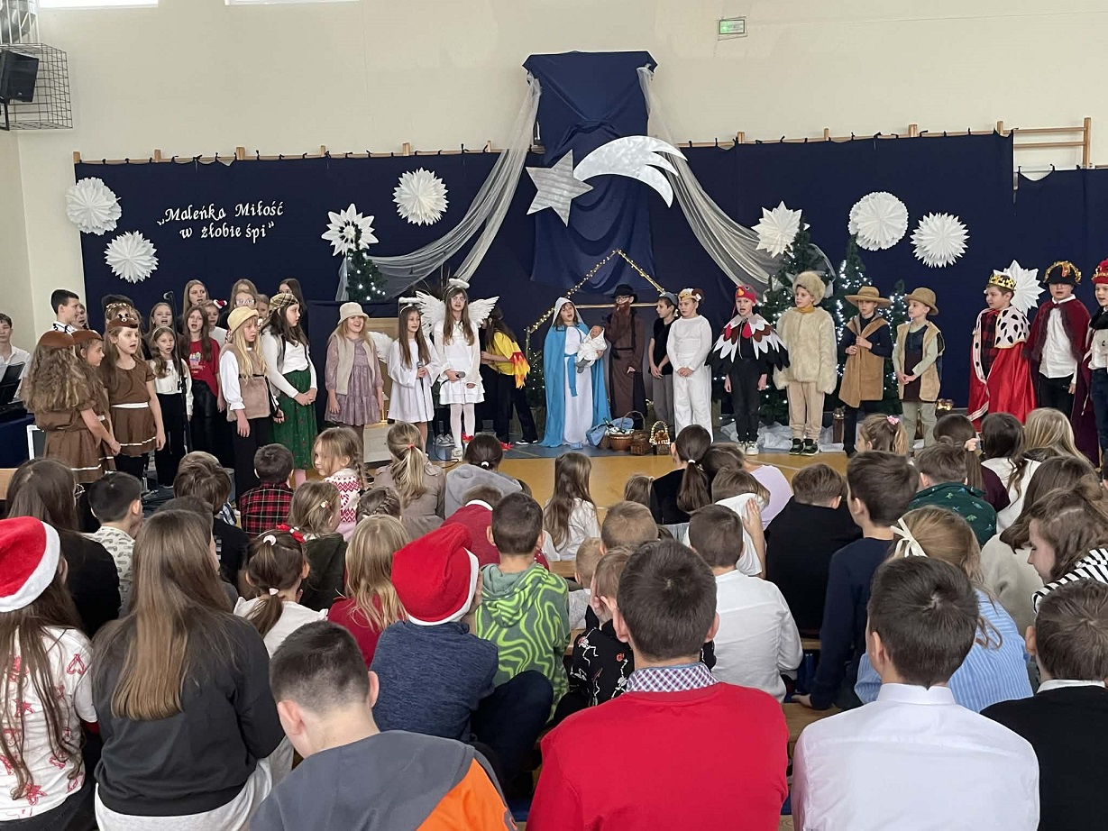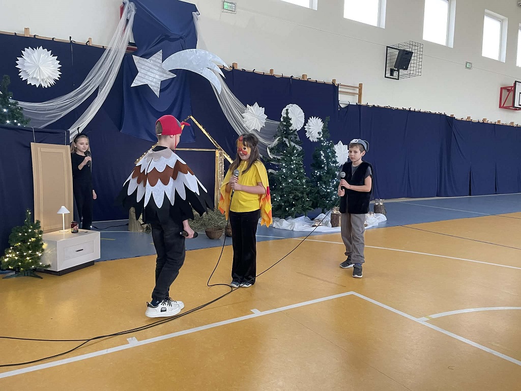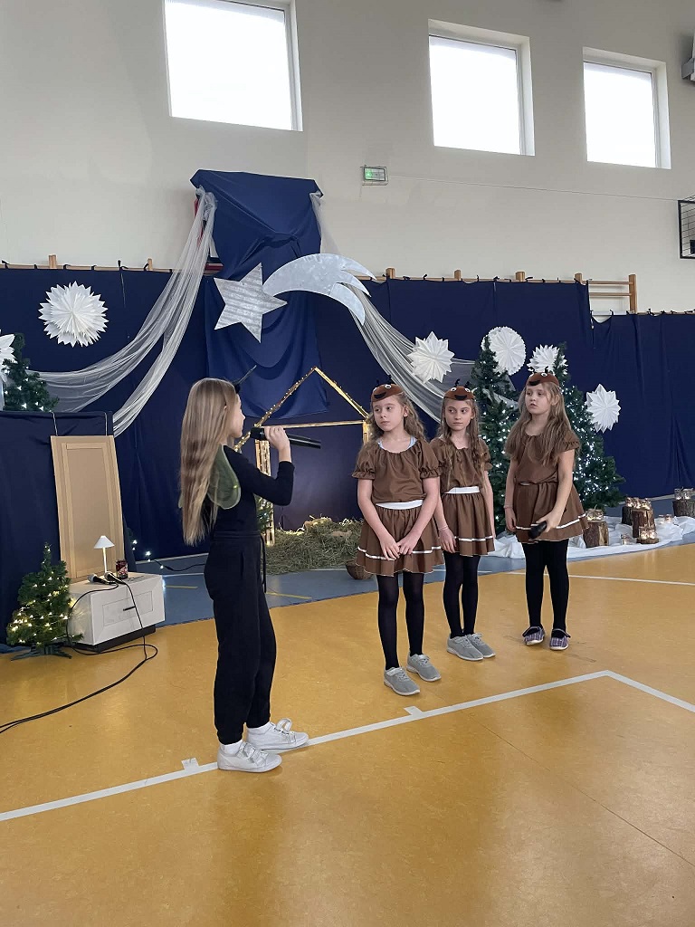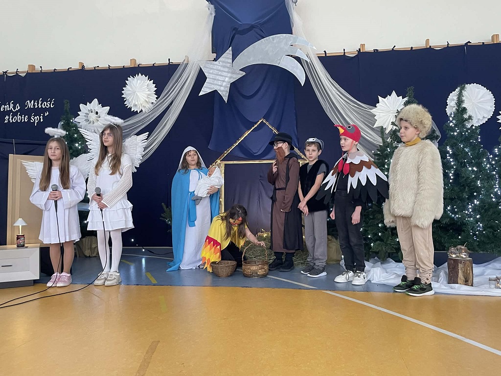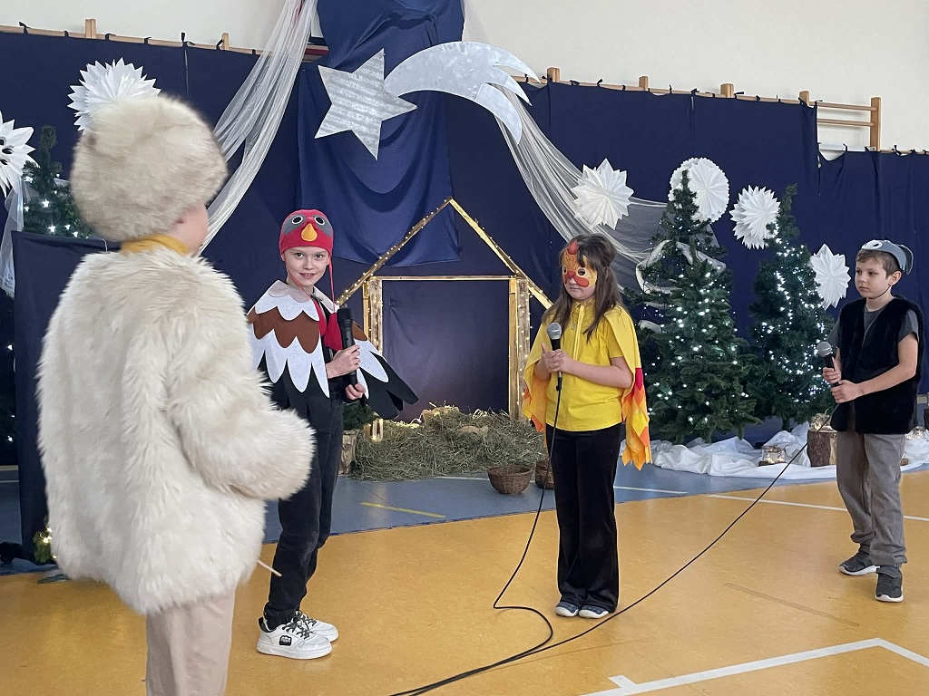 Jasełka przygotowane przez panią Żanetę Olejnik oraz dzieci z klasy trzeciej były pełne radości i ciepła. Mali aktorzy z wielkim zaangażowaniem przedstawili historię narodzin Pana Jezusa, a wyjątkowego uroku dodała obecność licznych zwierząt, które kolejno przychodziły do Betlejem, by powitać Dzieciątko. Każde z nich miało swoją rolę i w prostych, ale wzruszających słowach wyrażało radość z narodzin Zbawiciela.