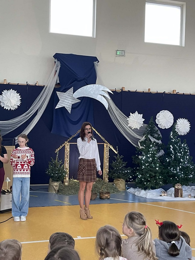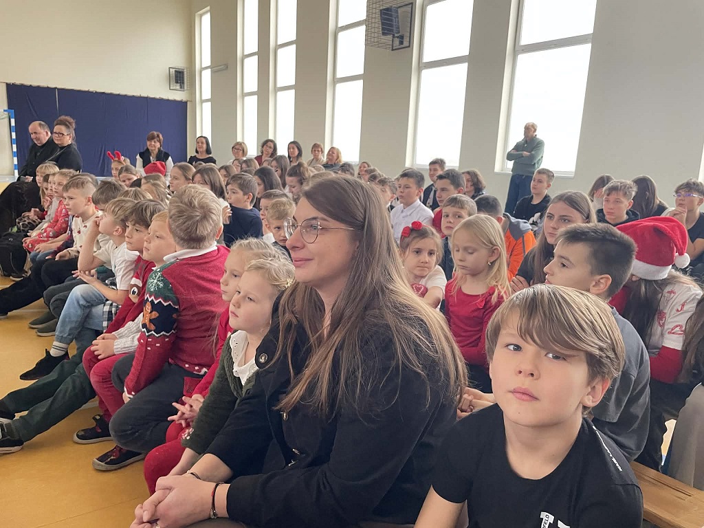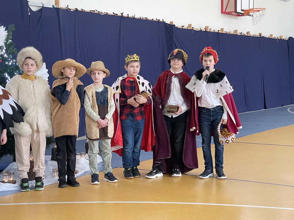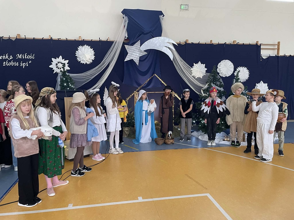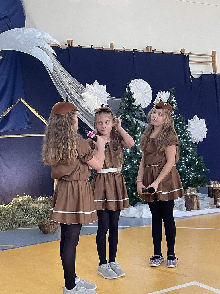 Jasełka przygotowane przez panią Żanetę Olejnik oraz dzieci z klasy trzeciej były pełne radości i ciepła. Mali aktorzy z wielkim zaangażowaniem przedstawili historię narodzin Pana Jezusa, a wyjątkowego uroku dodała obecność licznych zwierząt, które kolejno przychodziły do Betlejem, by powitać Dzieciątko. Każde z nich miało swoją rolę i w prostych, ale wzruszających słowach wyrażało radość z narodzin Zbawiciela.