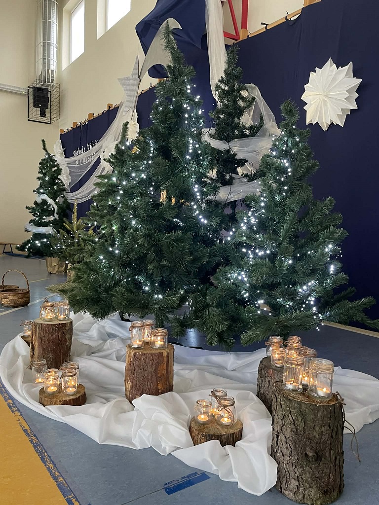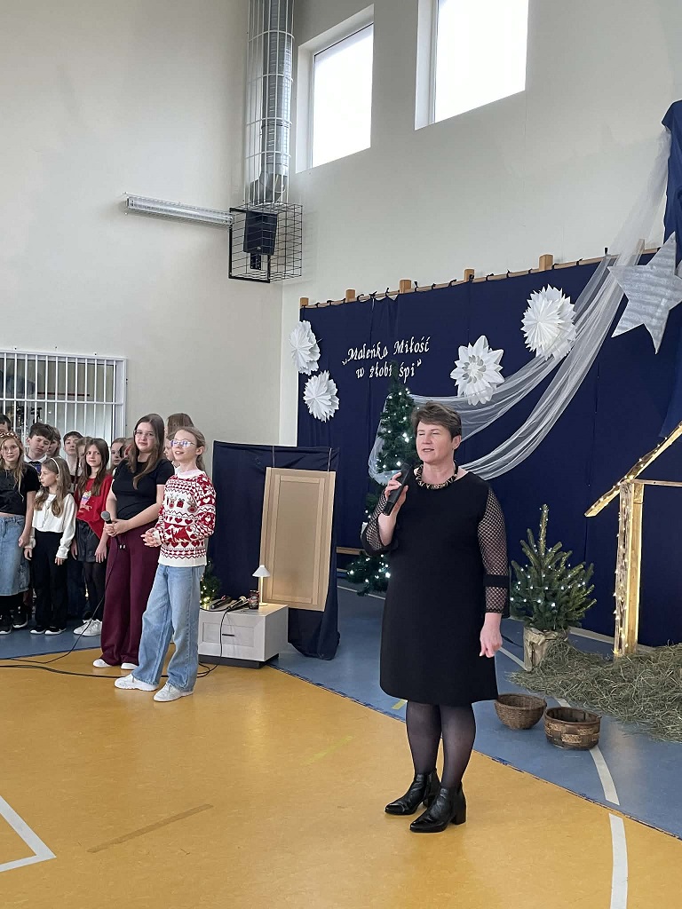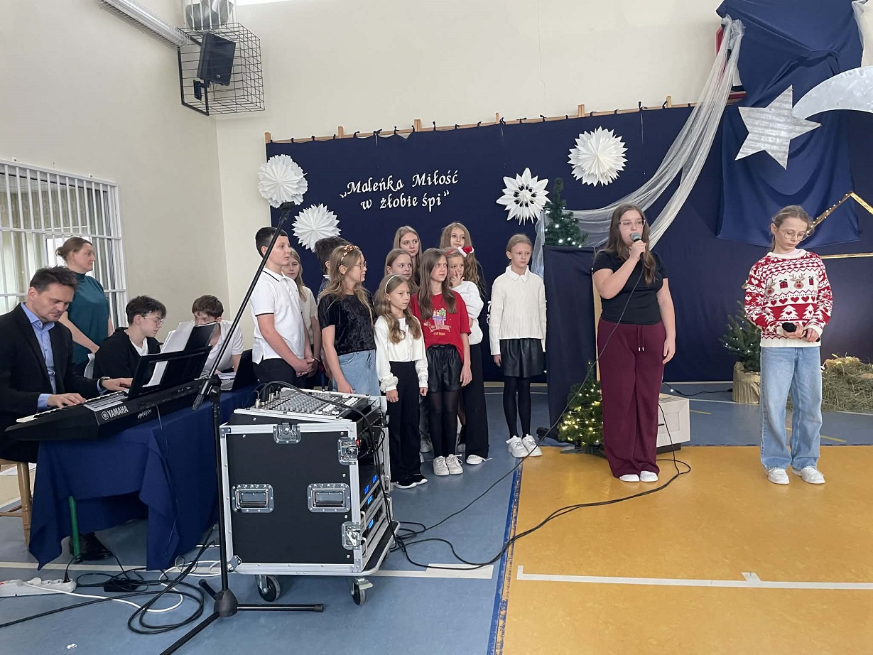 Uroczystość dopełniły pięknie wykonane kolędy śpiewane przez szkolny chór pod kierunkiem pana Roberta Bykowskiego oraz dekoracja autorstwa pani Karoliny Krawentek. Wspólny śpiew stworzył podniosłą atmosferę, która wprowadzała nas w świąteczny nastrój.