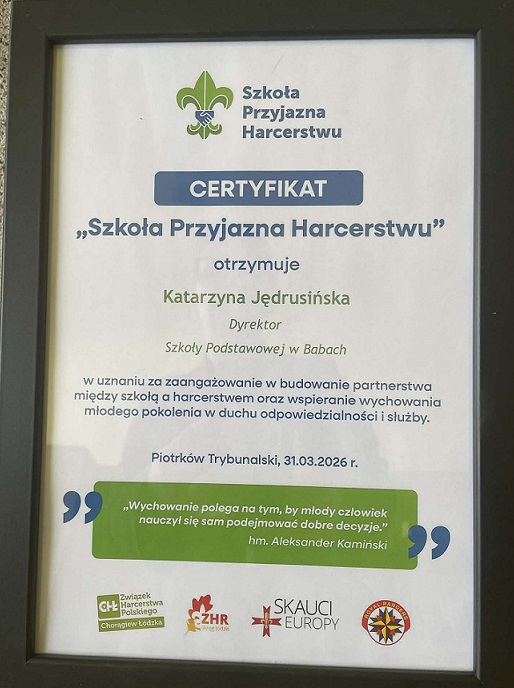 Szkoła Podstawowa im. Janusza Korczaka w Babach znalazła się w niezwykle zaszczytnym gronie. Otóż placówki, które współpracują z harcerzami bądź skautami, w których działają drużyny harcerskie, odbywają się zbiórki czy też zlokalizowane są harcówki, otrzymały z rąk Łódzkiego Kuratora Oświaty specjalne certyfikaty „Szkoły przyjaznej harcerstwu”. Na ręce Pani Dyrektor Katarzyny Jędrusińskiej wręczono naszej szkole tytuł „Szkoły Przyjaznej Harcerstwu ”. Jest to dla nas ogromne wyróżnienie i nadzieja na dalszą współpracę.