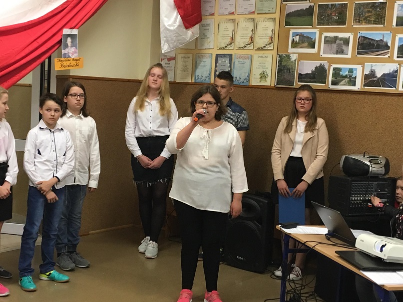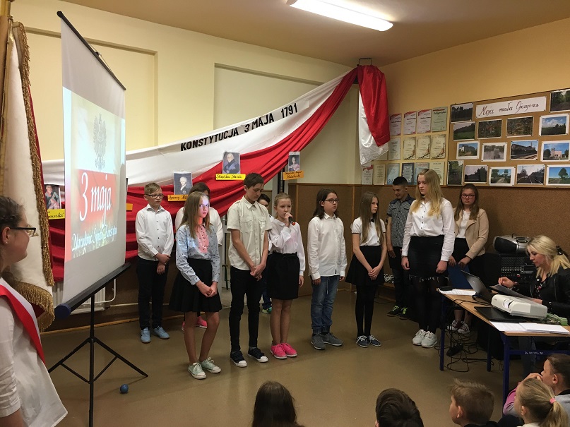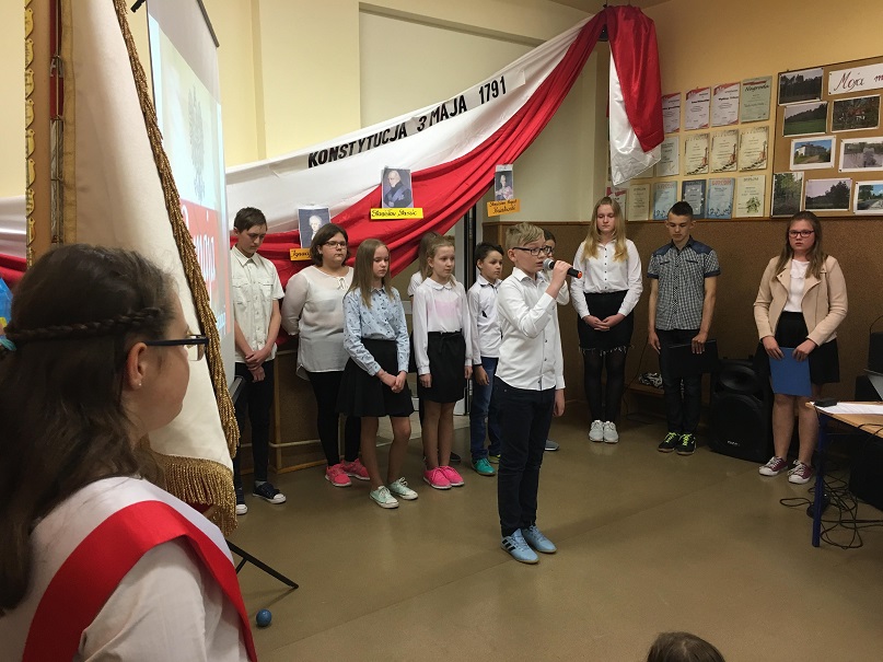 9 maja uczniowie klasy 6 pod opieką p. Adaminy Marek-Kot, przygotowali dla społeczności szkolnej montaż słowno muzyczny poświęcony 228 rocznicy uchwalenia Konstytucji 3 Maja. Uroczystość miała podniosły charakter. Na początek w asyście pocztu sztandarowego naszej szkoły wszyscy uczniowie odśpiewali hymn narodowy. Pani dyrektor powitała wszystkich zaproszonych gości, uczniów i pracowników szkoły. Prowadzący przypomnieli zebranym najważniejsze informacje na temat tak ważnego wydarzenia, jakim było uchwalenie drugiej na świecie, a pierwszej w Europie Konstytucji. Uczniowie zaprezentowali wiersze i piosenki patriotyczne.