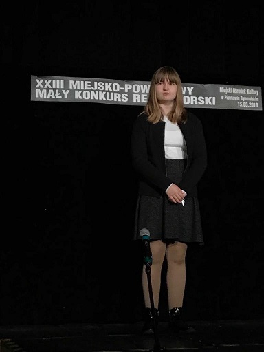 Uczennica kl. I Kalina Jędrzejczyk i uczennice kl. VIII : Julia Cybula i Natalia Sima otrzymały wyróżnienia w XXIII Miejsko - Powiatowym Małym Konkursie Recytatorskim organizowanym przez Miejski Ośrodek Kultury w Piotrkowie Tryb. W oczekiwaniu na werdykt jury dzieci uczestniczyły w warsztatach tanecznych..Warto wspomnieć, że w kategorii wiekowej kl. VII - III gimnazjum przyznano jedno trzecie miejsce, pierwszego i drugiego nie było, przyznano również sześć wyróżnień, wśród nich naszym ósmoklasistkom. Dziewczyny zaprezentowały interpretację głosową dwóch wierszy każda. Uczennica kl. I ćwiczyła pod kierunkiem wychowawczyni p. Teresy Włodarczyk , natomiast uczennice kl. VIII przygotowała polonistka p. Agnieszka Czechowska.. Gratulujemy wyróżnionym.