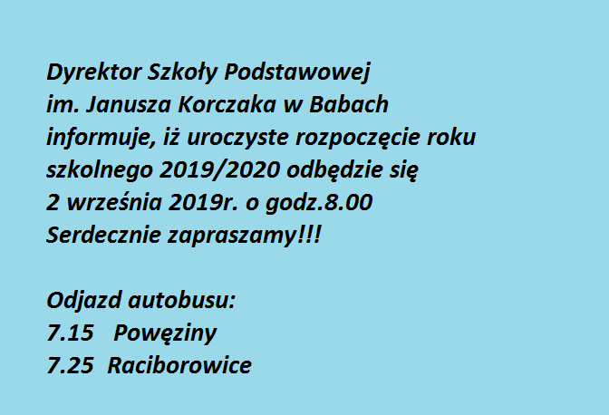 Dyrektor Szkoły Podstawowej im. Janusza Korczaka w Babach informuje, że uroczyste rozpoczęcie roku szkolnego 2019/2020 odbędzie się 2 września 2019r. o godz. 8.00.